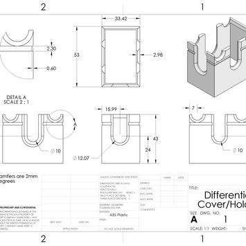 The motor mount/transmission as well as the main differential components are manufactured of abs thermoplastic using a 3D printing process. The parts are modeled in SolidWorks in accordance with the restraints placed by the printer. The steering rod is machined from 6061 aluminum flat bar stock and machined with the manual mill and drill press. With one hole in the middle of the bar and one on the servo wheel, a pin loosely mates with the two. Having the pin loose, allows for the steering rod to move back and forth without binding. A major change that was implemented during the construction phase of the project was the separation of the differential housing from one to two parts. The differential was split into two halves with slots that interlock when they are placed together. To facilitate this change, the differential cover design was changed also to include an exterior set of walls with cutouts where the shafts enter and exit the housing ne to two parts. The remaining parts were purchased.